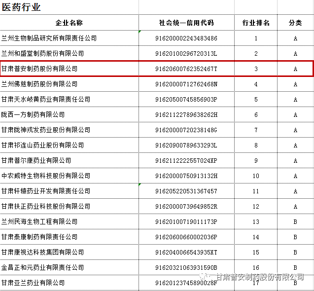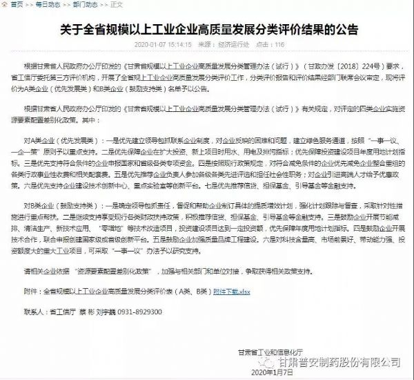 1月7日,根據甘肅省工業和信息化廳發布的“關于全省規模以上工業企業高質量發展分類評價結果”的公示,普安股份被評為全省規模以上工業企業高質量發展A類(優先發展類)企業,位列醫藥行業前三。此次分類評價工作經專業第三方評價機構評審,分類評價報告和評價結果經部門聯席會議審定,最終確定企業分類評價結果。普安股份將依據 “資源要素配置差別化政策”對A類企業的規定,加強與相關部門和單位對接,爭取獲得相關政策支持。