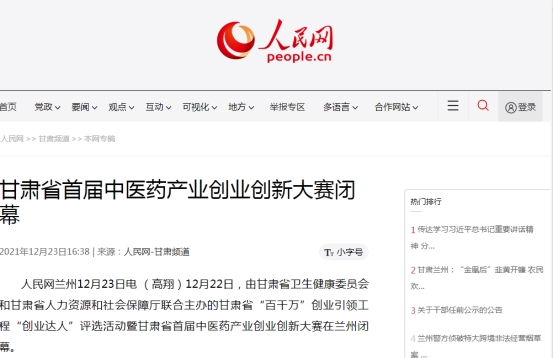 此次大賽也受到了媒體朋友的高度關注,相繼由人民網、中新網、今日頭條、試聽甘肅、新甘肅、甘肅青春調頻等多家媒體相繼報道了甘肅普安制藥股份有限公司在此次大賽中獲得創新組一等獎及“創業達人”稱號的事宜。