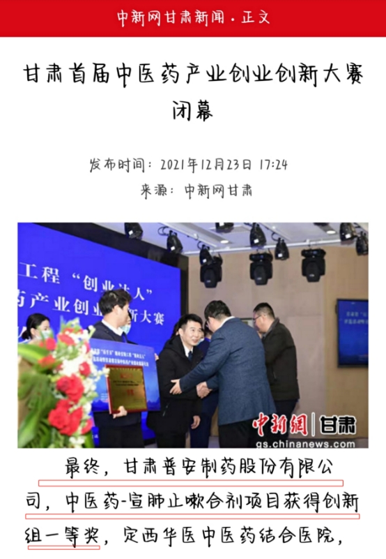 多家媒體爭相報道,“甘肅普安制藥股份有限公司榮獲甘肅省首屆中醫藥產業創業創新大賽創新組第一”強勢霸屏