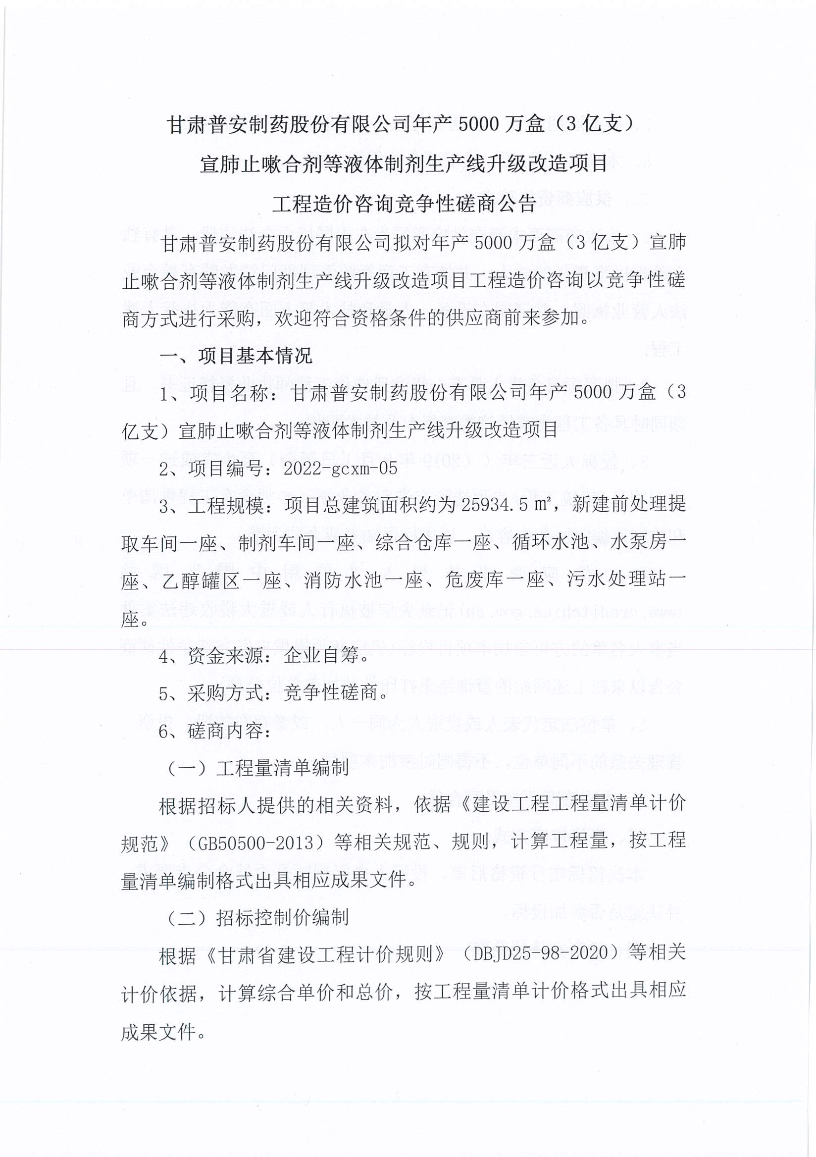 甘肅普安制藥股份有限公司年產(chǎn)5000萬盒(3億支)宣肺止嗽合劑等液體制劑生產(chǎn)線升級改造項目工程造價咨詢競爭性磋商公告