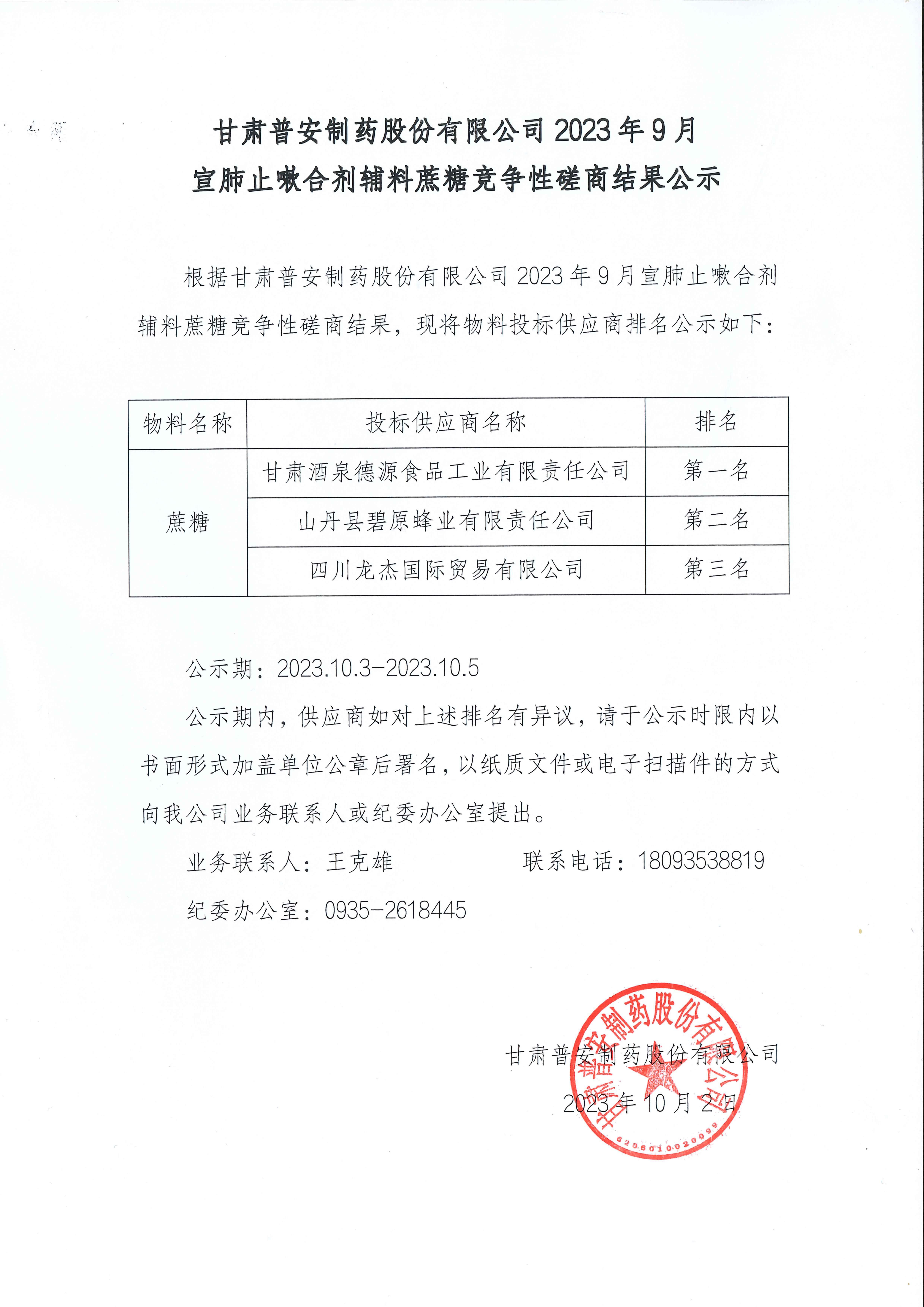 甘肅普安制藥股份有限公司2023年9月宣肺止嗽合劑輔料蔗糖競爭性磋商結果公示