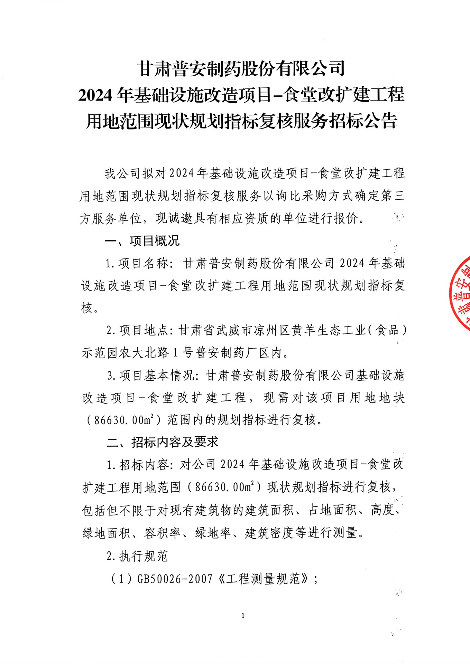 甘肅普安制藥股份有限公司2024年基礎設施改造項目-食堂改擴建工程用地范圍現狀規劃指標復核服務招標公告