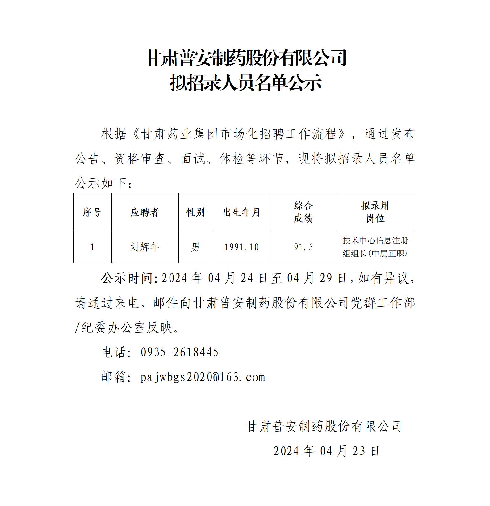 甘肅普安制藥股份有限公司 擬招錄人員名單公示