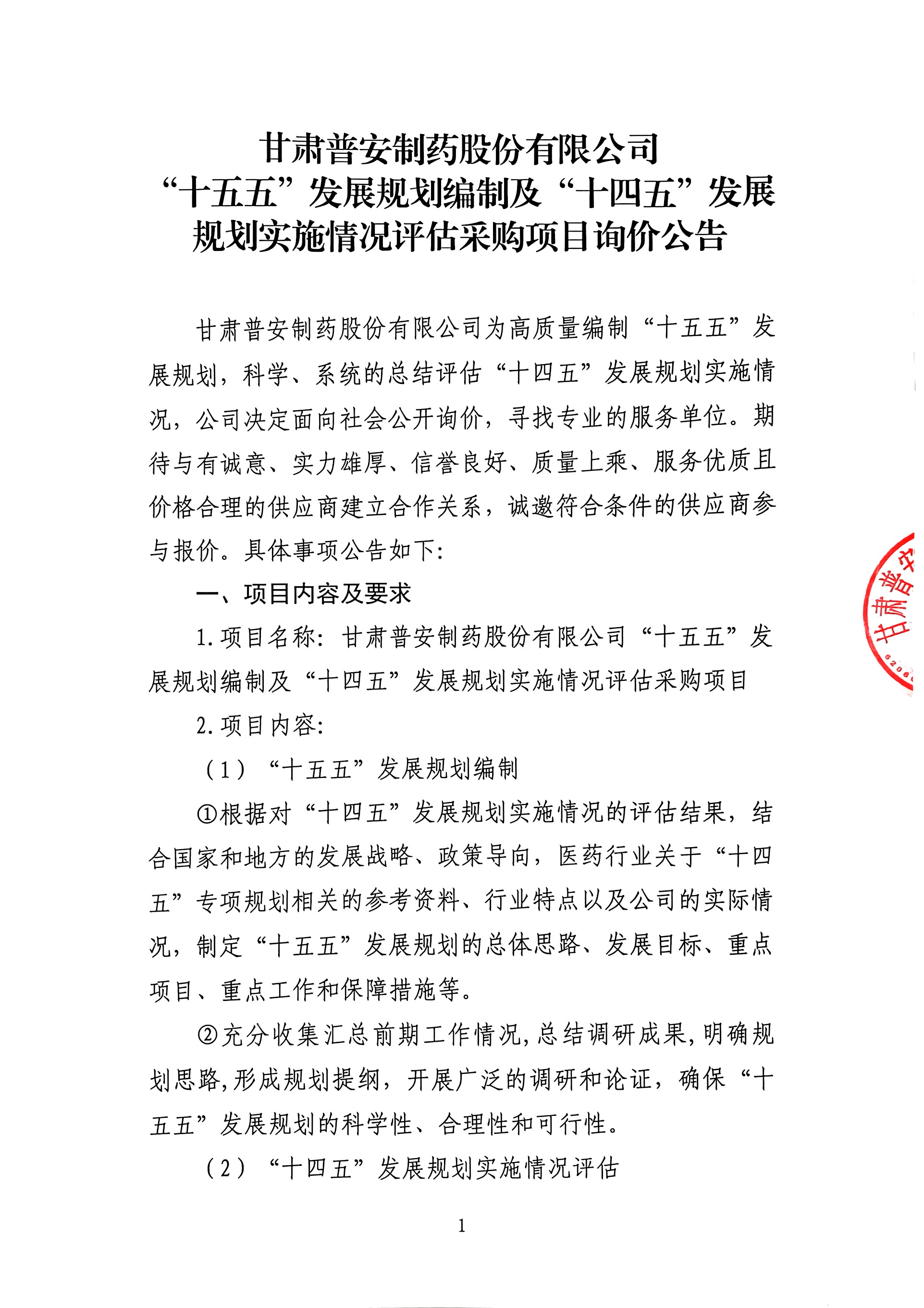 甘肅普安制藥股份有限公司“十五五”發(fā)展規(guī)劃編制及“十四五”發(fā)展規(guī)劃實施情況評估采購項目詢價公告