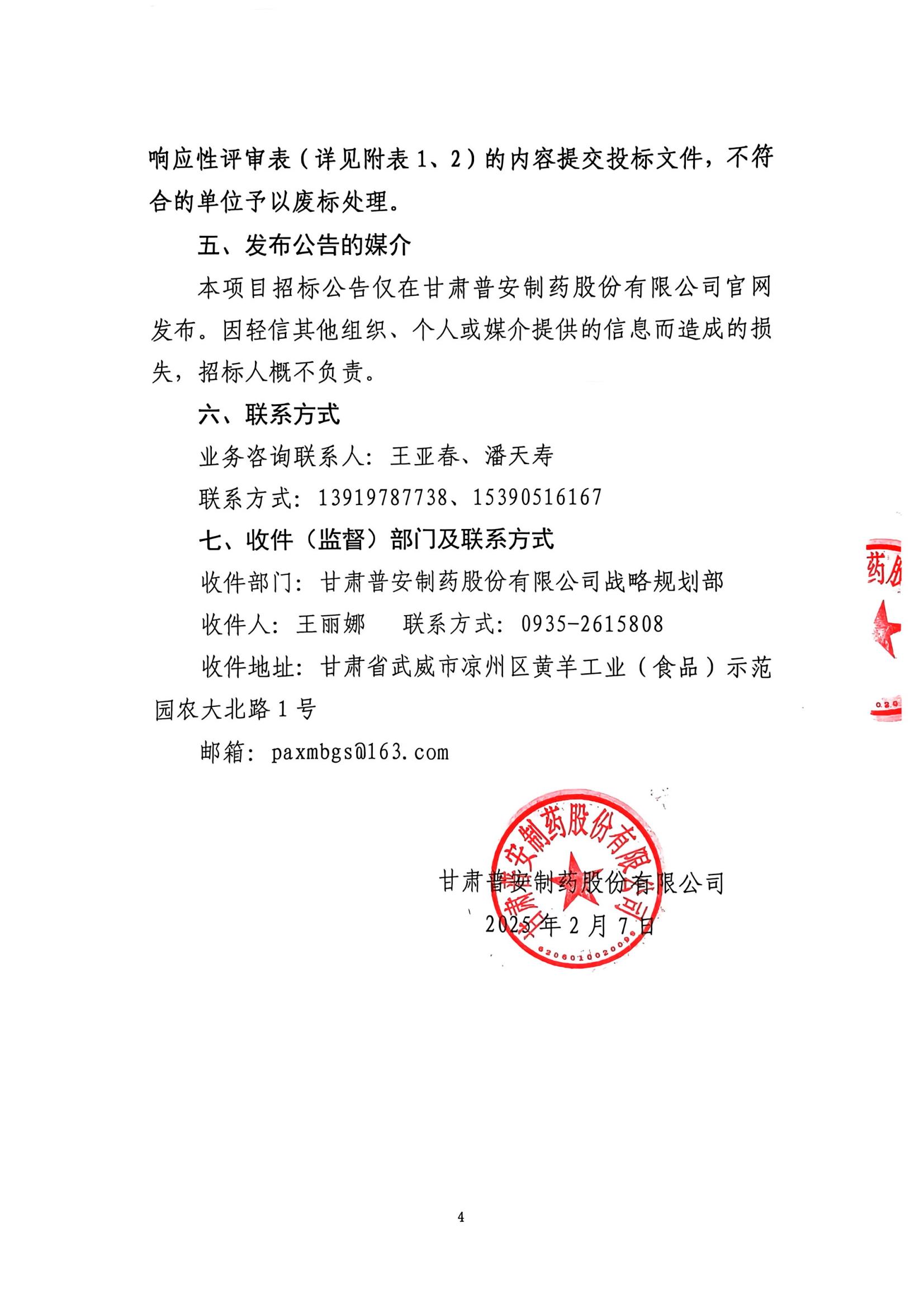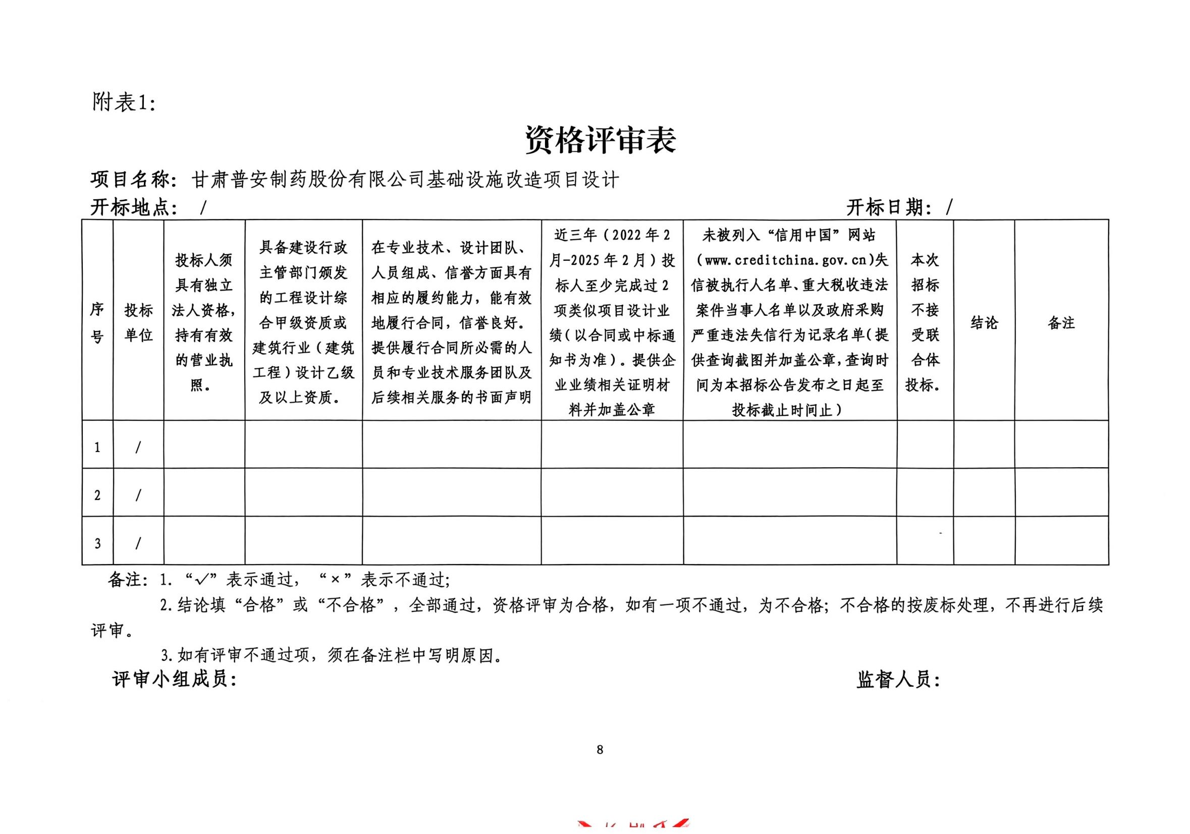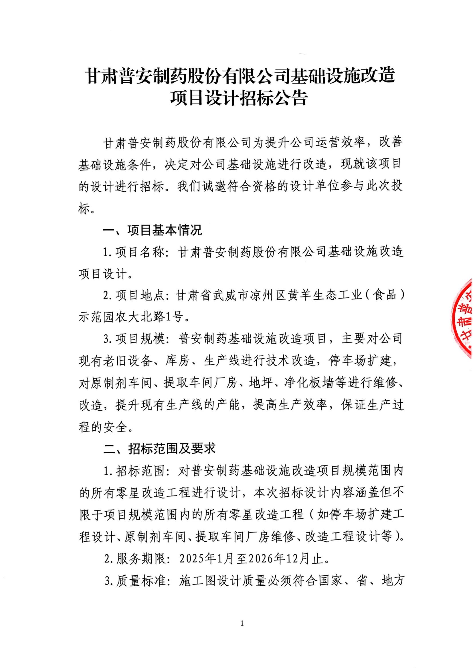 甘肅普安制藥股份有限公司基礎設施改造項目設計招標公告