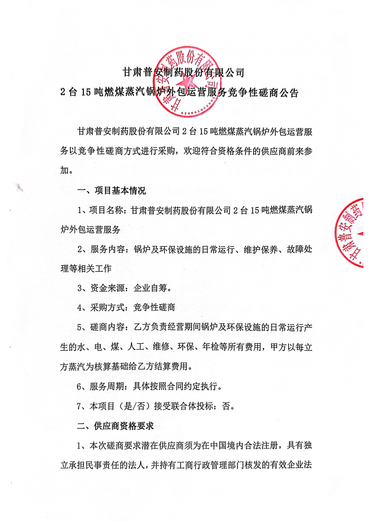 甘肅普安制藥股份有限公司2臺15噸燃煤蒸汽鍋爐外包運營服務競爭性磋商公告